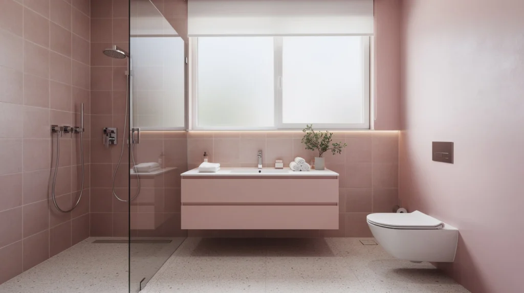Aujourd’hui, la salle de bain rose se réinvente grâce à des tendances alliant minimalisme, matières naturelles et touches personnalisées. Ainsi, le mix entre carrelage rose vif et éléments bruts (bois, béton, métal) fait sensation dans les projets contemporains. De plus, la superposition de tons proches (dégradé de roses) offre une profondeur inédite, idéale pour structurer l’espace.
